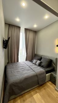 В квартире выделенная спальная зона с двуспальной кроватью и телевизором, и кухонная зона со столом, стульями, раскладным креслом и телевизором. Из кухонной зоны выход на балкон с садовой мебелью.