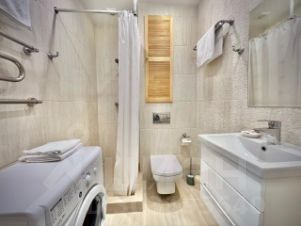Просторный санузел - с душем, стиральной машиной, феном. Гостям будут предоставлены набор полотенец и постельное белье.