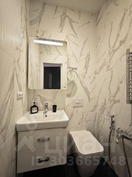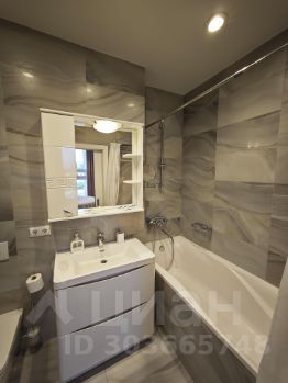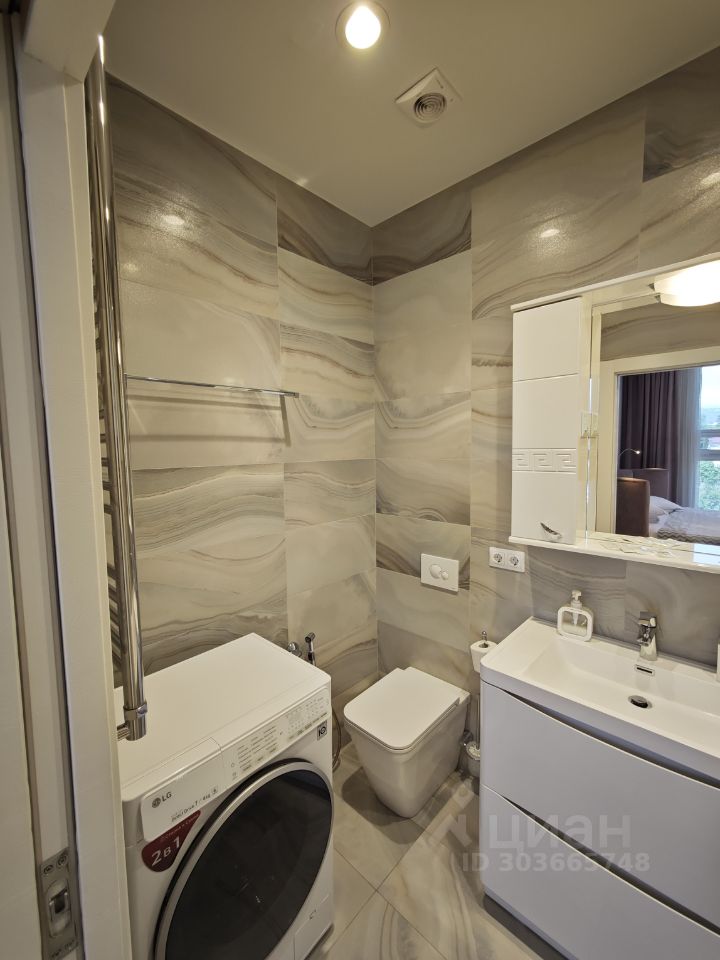 Ванная комната оснащена всем необходимым, включая ванную, полотенцесушитель, раковину и зеркало