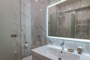 Ванная комната оснащена всем необходимым, включая душевую кабину, полотенцесушитель, раковину и зеркало