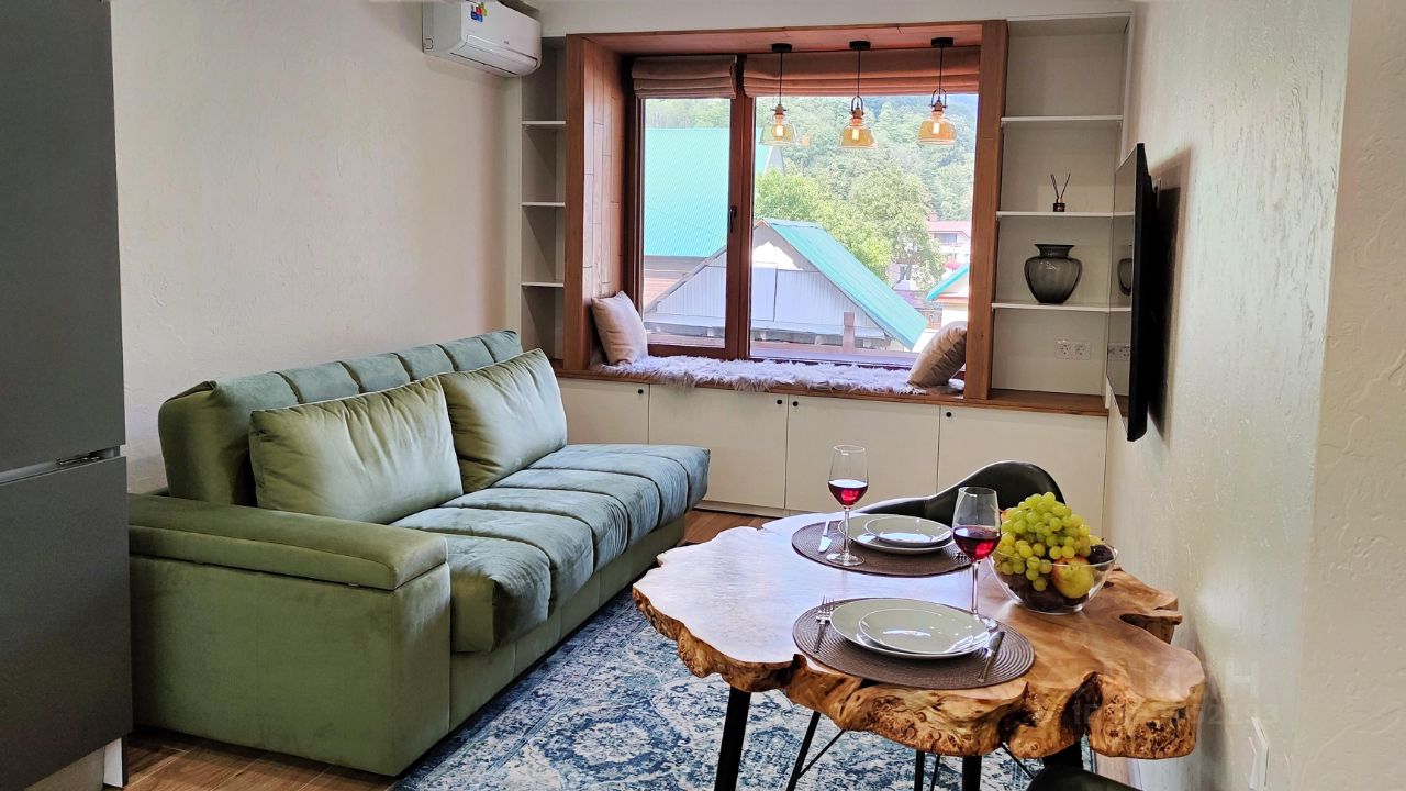 Светлый интерьер с большими окнами и зоной отдыха и гостиная с фактурным деревянным столом. Практичная кухня с полной комплектацией. Удобный санузел с ванной. Остановите выбор на этом апартаменте и вы насладитесь видом на горы и погрузитесь в атмосферу покоя и комфорта
