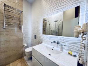 Ванная комната оснащена всем необходимым, включая душевую кабину, полотенцесушитель, раковину и зеркало