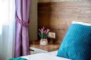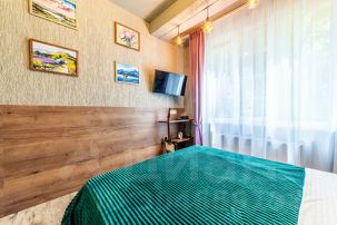 Планировка кваpтиpы: в спальне кровать 160*200 с ортопедическим матрасом, во второй комнате широкий диван и выход на открытый балкон с видом на лес.