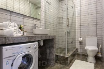 Санузел с душевой кабиной, раковиной с зеркалом, унитазом и стиральной машиной.