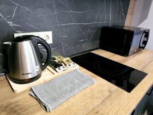Номер оборудован полноценной кухней: холодильник, варочная панель, микроволновка, чайник, полный комплект посуды
