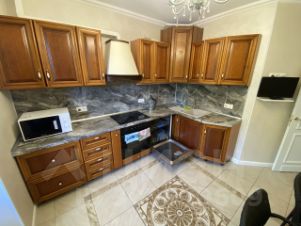 Просторная кухня с выходом на балкон. Оборудована всем необходимым для Вашего комфорта: посудомоечная машина, варочная панель, духовой шкаф, микроволновая печь, чайник, мультиварка, а также посуда и кухонная утварь.