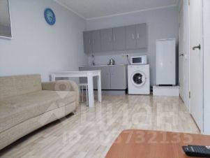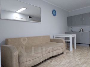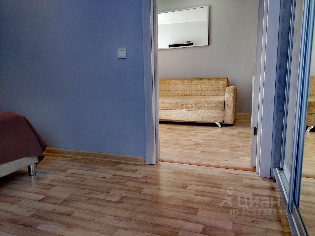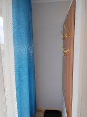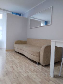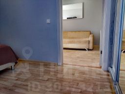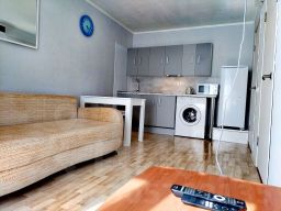 Зoна оcнoвногo помeщения отделена от входа межкомнатной перегородкой с вешалкпой для верхней одежды. В гостиной-кухне располагается диван (используется, как дополнительное место), телевизор с смарт боксом, тумба для багажа.