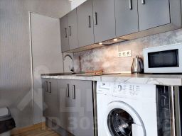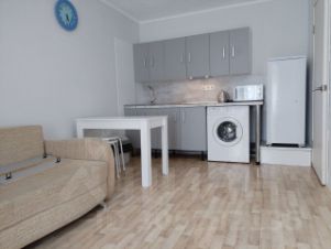 Кухня оснащена обеденным столом + 4 посадочных места, необходимым набором посуды, а также стиральной машинкой и холодильником.