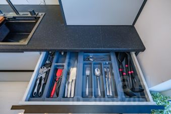 — Кухня: Индукционная плита, посудомойка, холодильник, микроволновка, чай/кофе