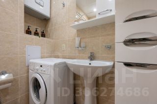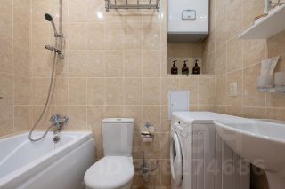 Санузел с ванной, раковиной с зеркалом, унитазом, бойлером и стиральной машиной. Косметические принадлежности: гель для душа, шампунь, кондиционер, мыло для рук.