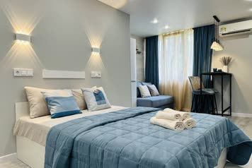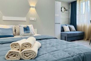 Студия: кухня (холодильник, микроволновая печь, варочная панель, эл. чайник, стиральная машинка), раскладной диван, совмещённый с/у, спальня (двуспальная кровать, ТВ), гладильная доска, сушка для белья, фен, утюг, посуда. Wi-fi. Двуспальная кровать и раскладной двуспальный диван.