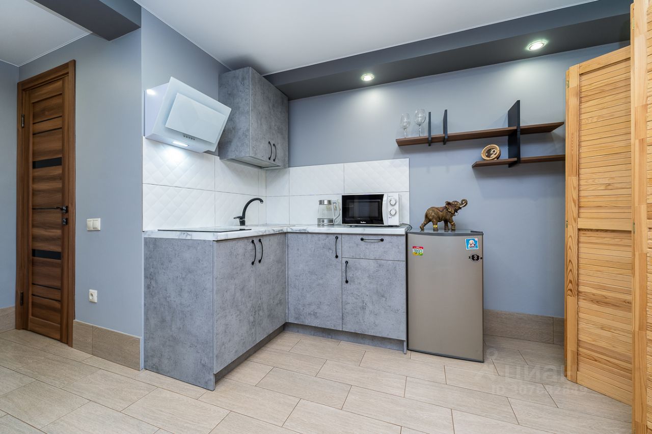 2. Выделенная обеденная зона и оборудованная кухня: холодильник, встраиваемая варочная панель, вытяжка, микроволновая печь, чайник, посуда, столовые приборы.