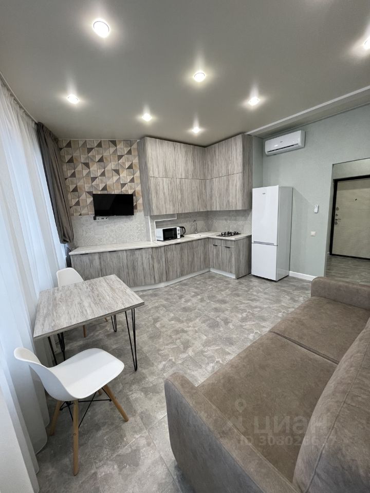 В квартире выполнен дизайнерский ремонт, что создает атмосферу комфорта и уюта. Студия полностью меблирована: есть удобная мебель на кухне и в комнате. Здесь также установлена вся необходимая техника для комфортного проживания: кондиционер, холодильник, телевизор, стиральная машина. Санузел совмещенный, оснащен современной душевой кабиной.