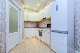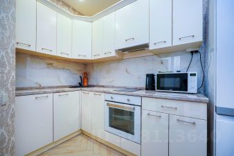 3. Выделенная обеденная зона. Оборудованная кухня в современном стиле: встраиваемый духовой шкаф, холодильник, встраиваемая варочная панель, встраиваемая вытяжка, микроволновая печь, чайник, посуда для приготовления, столовая посуда и приборы, кухонные принадлежности.