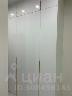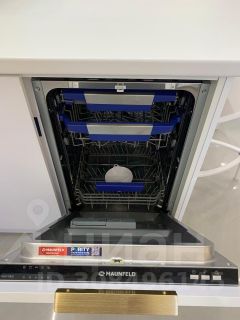 Вся техника встроенная и современная, фасады — белоснежные, с доводчиками и золотистой фурнитурой.