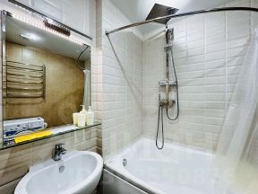 Ванная комната оснащена всем необходимым, включая душевую кабину, полотенцесушитель, раковину и зеркало