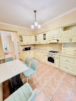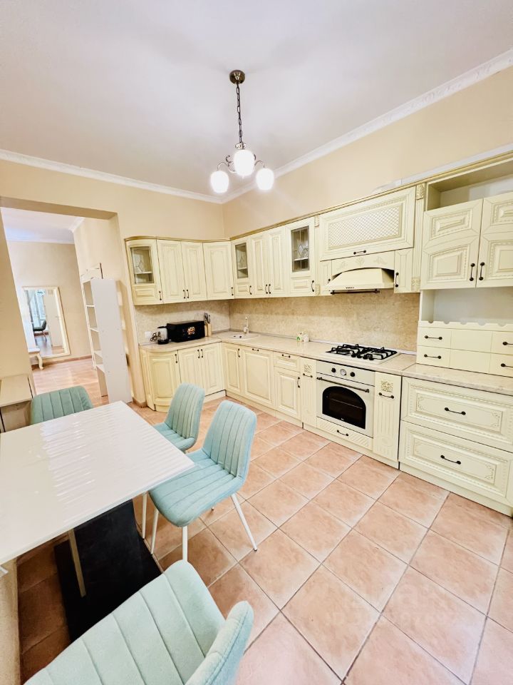 Общая площадь квартиры составляет 150 кв.м, из которых 100 кв.м — жилая площадь, а кухня занимает 30 кв.м. Квартира расположена на первом этаже трехэтажного дома, что особенно удобно для семей с детьми или пожилых людей. Высота потолков — 3 метра, что добавляет ощущение простора и света.