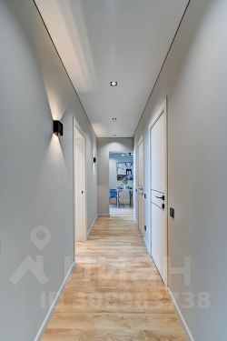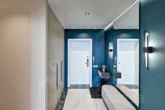 В прихожей большое зеркало, подвесная тумба, скамья-пуфик и вместительный шкаф.