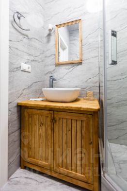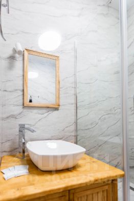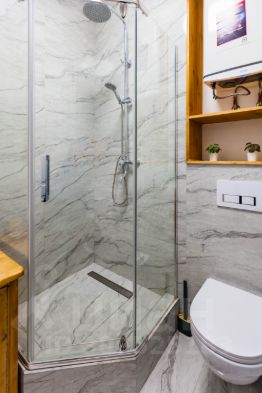 Современный санузел с душевой кабиной, WiFi, телевизор, кондиционер, а также шкаф с плечиками для одежды, гладильная доска, утюг и сушилка.