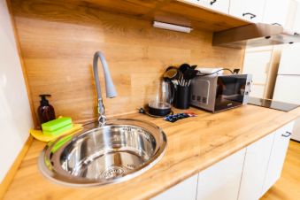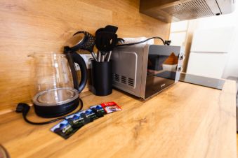 Удобства: Полностью оснащенная кухня с индукционной плитой, холодильником, электрическим чайником и микроволновой печью, а также вся необходимая посуда и кухонная утварь.