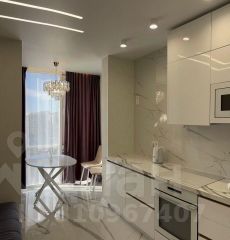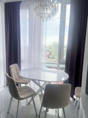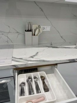 Кухня оборудована всем необходимым. Духовой шкаф, варочная панель, встроенная микроволновая печь, чайник, посуда. Обеденная зона с панорамным прекрасным видом из окна на город и море. Установлен большой обеденный стол. Диван раскладывается в спальное место.