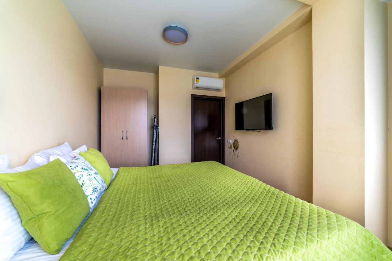 - первая спальня с двуспальной кроватью шириной 180 см., шкафом для одежды, телевизором;