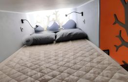 В комнате удобный раскладной диван 150х200 см, на втором ярусе кровать для двух детей от 7 лет или одного взрослого.