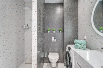 Санузел оборудован душевой с дорогой и качественной сантехникой, стиральной машиной и феном.