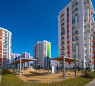 От аэропорта до жилого комплекса ехать 15 минут. Также продукты можно заказать в магазине ВкусВилл (бесплатная доставка в течение двух часов).