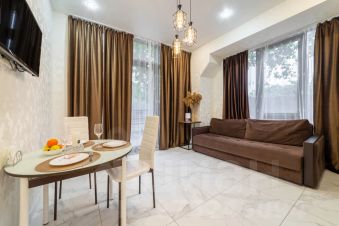 Зонированное освещение позволяет создать подходящую атмосферу для вашего настроения.В спальне имеется отдельная гардеробная, двухспальная кровать, зал и кухня совмещены( диван раскладывается).