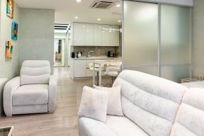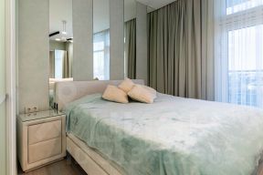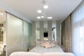 Спальная зона — это оазис уюта и спокойствия, аккуратно отделенный от кухни элегантной матовой стеклянной перегородкой