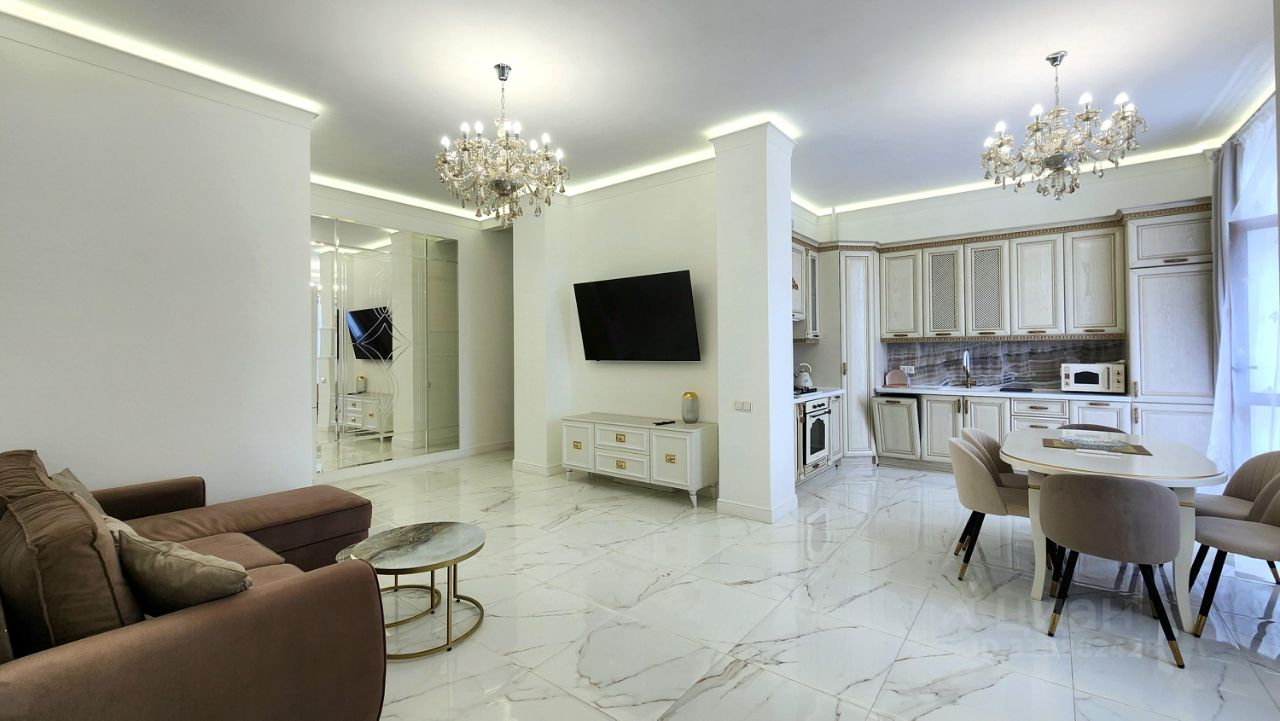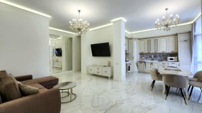 Просторная кухня-гостиная, три изолированные спальни, две из которых со своей ванной комнатой, гостевой санузел (всего три). Из всех комнат есть выход на балкон.