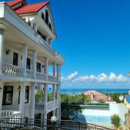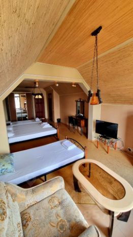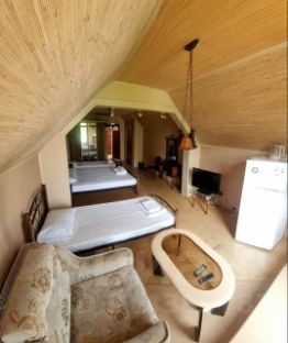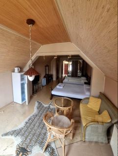 Уютный однокомнатный номер 35 кв. м. на 5 мансардном этаже. В номере: 1 двуспальная кровать, 2 односпальные кровати, трюмо, журнальный стол, набор посуды, стулья, кабельное ТВ, шкаф-купе, холодильник, кондиционер. Ванная комната с душем. Вид на внутренний двор, бассейн, море, горы. Рядом с номером находится обзорная площадка - отрытая терраса с прямым видом на море (для гостей доступна пляжная мебель: стол, кресла, лежаки).