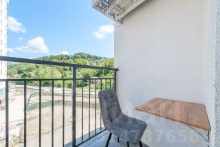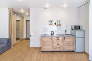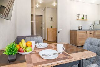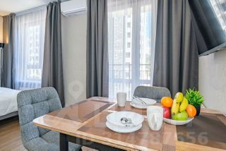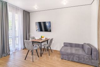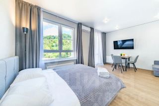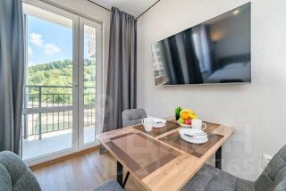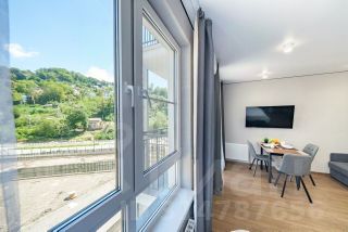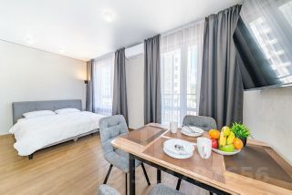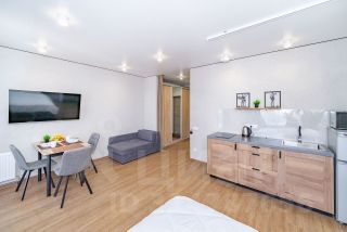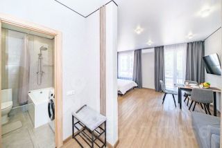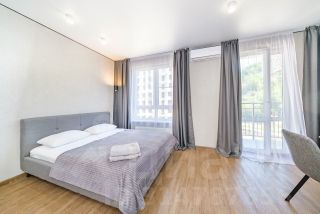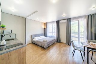 Студия с новым ремонтом, с собственным выходом к речке, с парковкой на территории комплекса и большой детской площадкой.