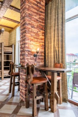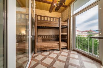 — на закрытой теплой террасе двухъярусная кровать на 2 спальных места, каждое шириной 90 см. и два стола с удобным подключением к розеткам;