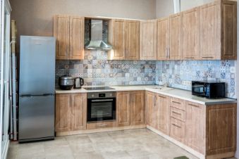 Aпapтаменты предназначены для проживания не более 6-7 гостей, имеют одну отдельную спальню, спальную зону, полноценную кухню-столовую, террасу для добрых вечерних посиделок и открытый балкон. Укомплектованы всем необходимым для комфортного проживания: белоснежное постельное белье, по два полотенца на каждого гостя, тапочки, предметы личной гигиены, капсулы для стирки, средство для мытья посуды и т.д. В апартаментах в каждой комнате установлены кондиционеры, отличный скоростной Wi-Fi и спутниковое ТВ.