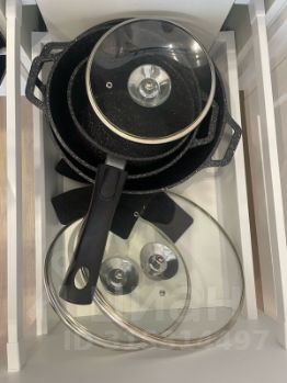 Кухня со всем необходимым, в том числе посуда для приготовление пищи и сервировки