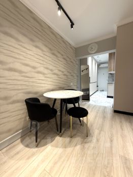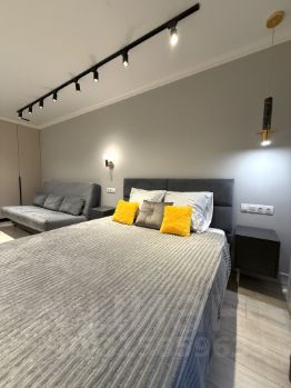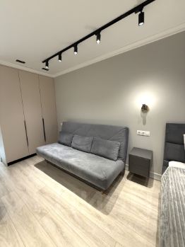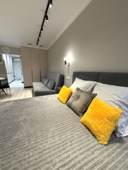 Студия отличается просторной планировкой с выделенной зоной кухни. Здесь вас ожидают кровать с удобным матрасом и раскладывающийся диван, а также множество мест для хранения вещей.