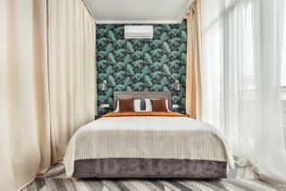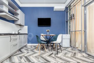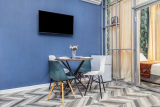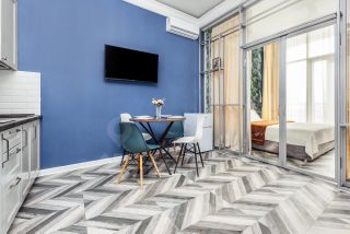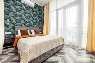 В апартаментах выполнен дизайнерский ремонт с полным оборудованием всем необходимым для комфортного проживания. Площадь апартаментов - 38 кв. м. (кухня-гостиная, с/у, спальня и балкон с живописным видом на горы). Интерьер апартаментов включает в себя: