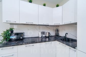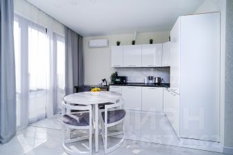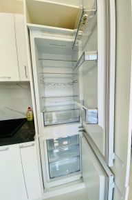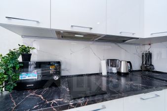 3. Выделенная обеденная зона. Оборудованная кухня в современном стиле: встраиваемый холодильник, встраиваемая варочная панель, встраиваемая вытяжка, микроволновая печь, чайник, посуда для приготовления, столовая посуда и приборы, кухонные принадлежности.