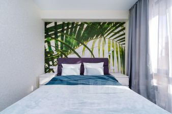 1. Спальная зона для качественного сна, а также рабочее место для творчества и созидания: двуспальная кровать, двуспальный раскладной диван, стол, шкаф для одежды.