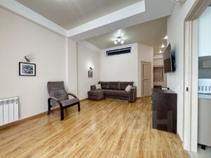 Просторная однокомнатная квартира с отдельной спальней. Светлая изолированная кухня. Просторная гостиная с удобным большим диваном и панорамным окном во двор и угловым видом на море.