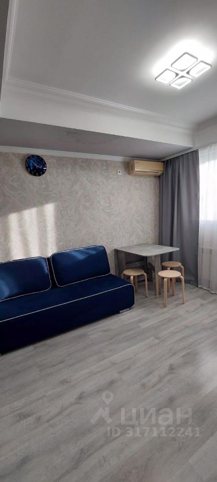 Студия выполнена в стиле "евроремонт": свежая отделка, современная мебель и качественная техника. В комнате есть всё необходимое для комфортного проживания: кондиционер, холодильник, телевизор и стиральная машина. Санузел совмещённый, оборудован ванной, что позволяет расслабиться после трудового дня. Окна выходят во двор, поэтому в квартире тихо и спокойно.