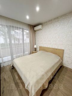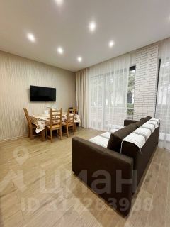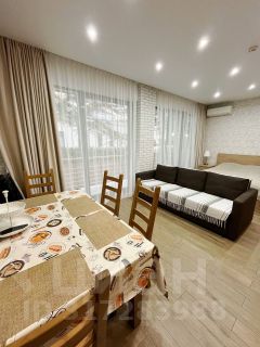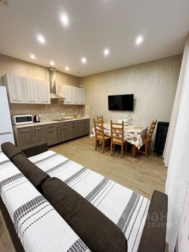 Апартаменты представляют из себя объёмную студию с большим панорамным остеклением что предает абсолютную насыщенность теплом и светом. В гостиной располагается кухня, раскладной диван, обеденный стол, телевизор, и выход на балкон. Правильное зонирование площади и хорошего ремонта передает достаточную гамму ощущений предполагаемого заказа. Номер располагается на втором этаже, к вам не кто не будет заглядывать через остекление, вид со второго этажа намного лучше, видно лесной массив.