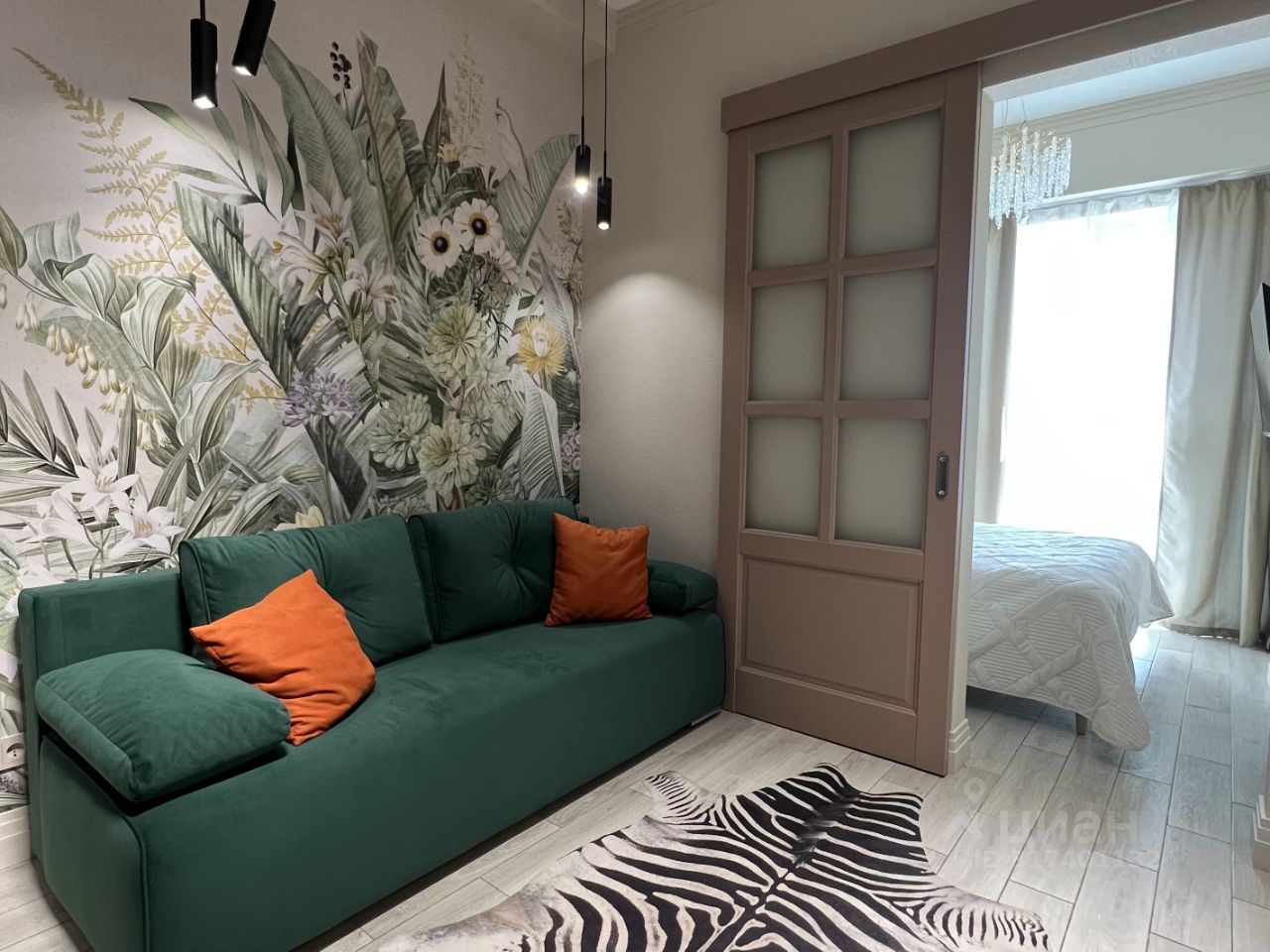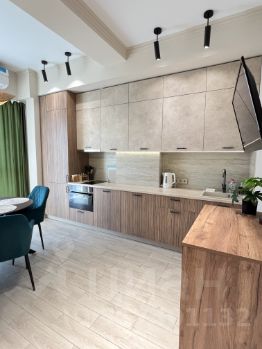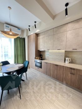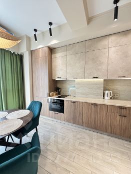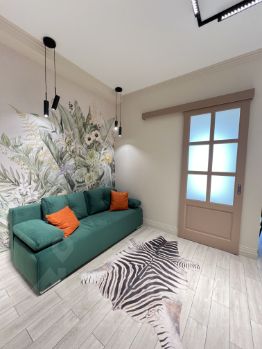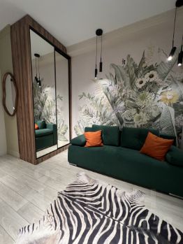 В квартире выделена спальня, есть зона гостиной с удобным диваном. Кухня просторная, оборудована техникой и всем необходимым.