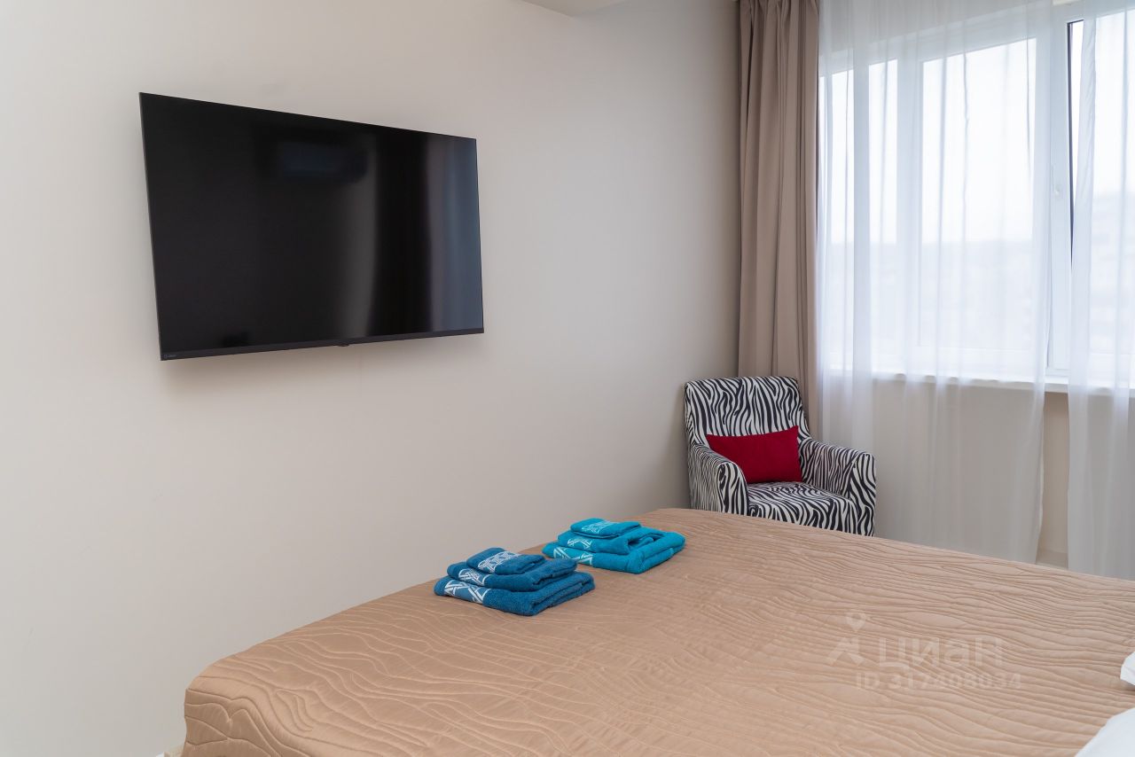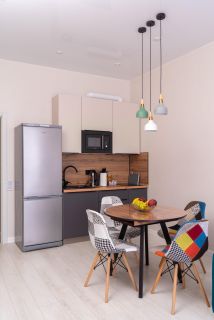 Квартира распланирована в отдельную просторную спальню с евро -кроватью 190*210 см ,кухню -гостиную с раскладным диваном , гардеробную , просторный коридор и сан.узел с душевой .