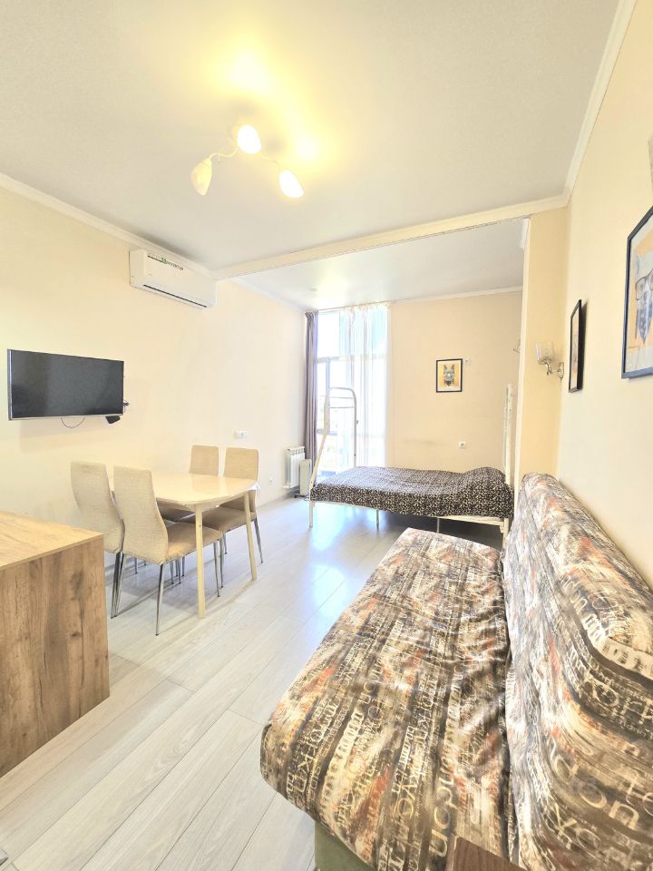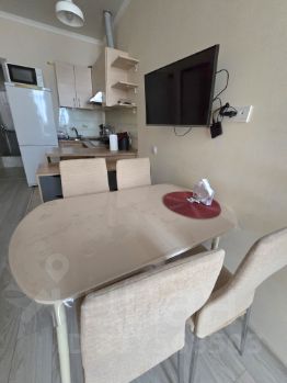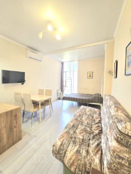 хорошим ремонтом в новом доме. Есть все необходимое для жизни и отдыха- бытовая техника, мебель, посуда. Удобное местоположение- рядом остановка транспорта, магазины, гипермаркет, школа, дет.сад и многое другое. Парковка у дома. Квартира-студия, зонирована на комнату и гостиную. Спальные места- двуспальная кровать и раскладной диван. Есть гардеробная.