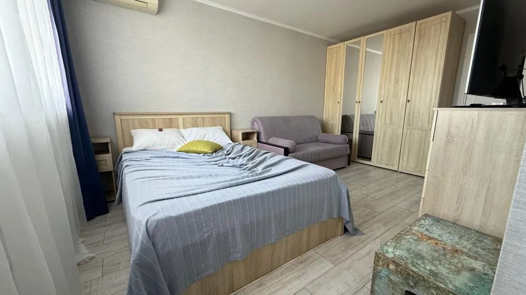 1 изолированная спальня с кроватью с ортопедическим матрасом, диван-кровать комфорт-класса и смарт tv, шкаф для одежды и выход на балкон с видом на море".