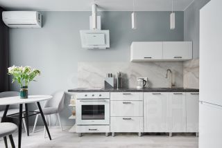 Кухня, оборудованная всем необходимым: варочная панель, духовой шкаф, холодильник, микроволновая печь, посудомоечная машина, чайник, набор посуды для приготовления еды и сервировки стола.