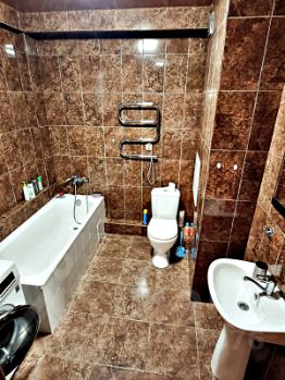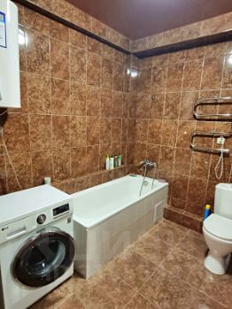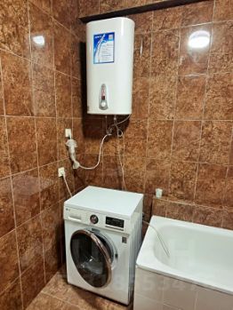 В просторном санузле есть унитаз, ванна, раковина, бойлер, стиральная машина, зеркало, фен.